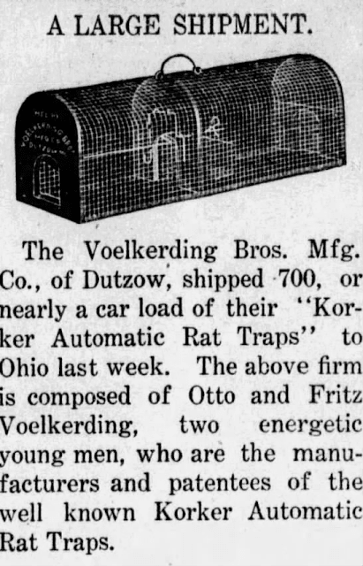 The rat trap factory in Dutzow apparently did not last long. It continued in business at least until September, 1907, when the Marthasville newspaper last mentions it. In the 1910 Federal Population Census, no Voelkerdings in either Warren County or St. Charles County were involved in manufacturing. Fritz Voelkerding was a farmer near Wolke's Spur, and Otto Voelkerding was a blacksmith in Washington, Franklin County, having moved from the Dutzow house next to the rat trap factory. I could find no reference to Korker Automatic Rat Traps anywhere in the United States after 1907.